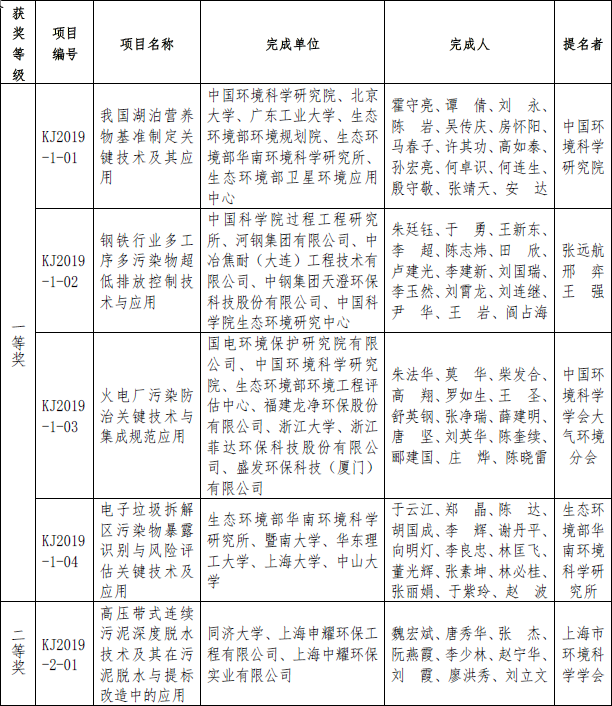 2019年度环境保护科学技术奖拟授奖项目名单公示